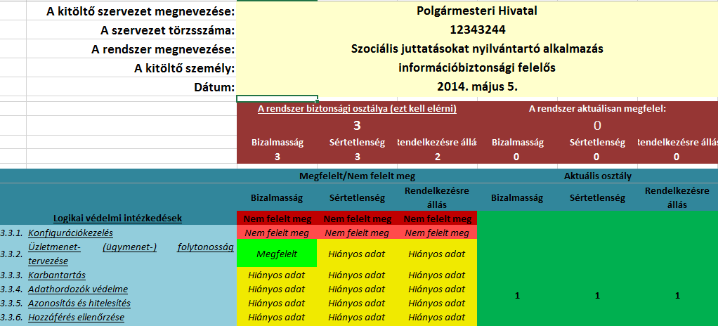 A meglévő logikai védelmi intézkedések hiányosságait a logikai védelmi intézkedések összesítő lapján tekinthetjük át. 2. ábra NEIH segédlet - Logikai védelmi intézkedések összesítése - részlet Az összesítésben látható, hogy a kötelezően előírt intézkedések az adott választól függően megfelelt (teljesíti a követelményt), nem megfelelt (nem teljesíti a követelmény), illetve hiányosak (nem megfelelő kitöltés) lehetnek. A nem kötelező mezők értelemszerűen azt jelzik, hogy ezen a biztonsági osztályon az adott követelmény teljesítése nem kötelező. 3. ábra NEIH segédlet - Jelenlegi biztonsági osztály - részlet Az összegzés fülön látható, hogy az informatikai rendszerünk nem éri el az elvárt biztonsági osztályt, tehát a hiányosságokra cselekvési tervet kell készítenünk. A cselekvési tervet a nem megfelelt jelzéssel ellátott követelményekre kell elkészítenünk. A következőkben egy lehetséges cselekvési terv mintát mutatunk be: 4. ábra Cselekvési terv minta a logikai védelmi intézkedésekhez – részlet A táblázatban látható, hogy a technológiai vhr követelményei mellé konkrét intézkedéseket rendeltünk felelős és határidő megjelölésével. Határidők megadásánál az Ibtv. által meghatározott fokozatosság elvét követjük (kétévenként kell egy osztályt lépni).